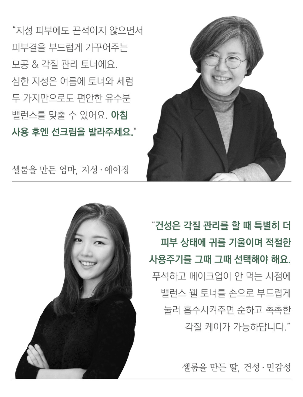 그래서 셀룸 밸런스 웰 토너에는 과하지도 부족하지도 않게 균형을 잘 잡자는 뜻의 이름에 담긴 것처럼 이 세 가지 균형을 잡아줄 성분들을 효과적으로 배합했어요. 만약 각질 주기로 인한 피부 고민이 없다면, 토너는 과감히 스킵하거나 각질 제거 기능이 없는 스킨 에센스를 사용해도 좋답니다.