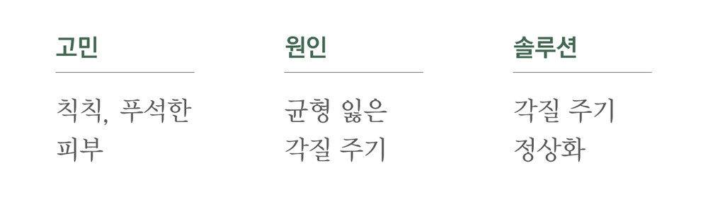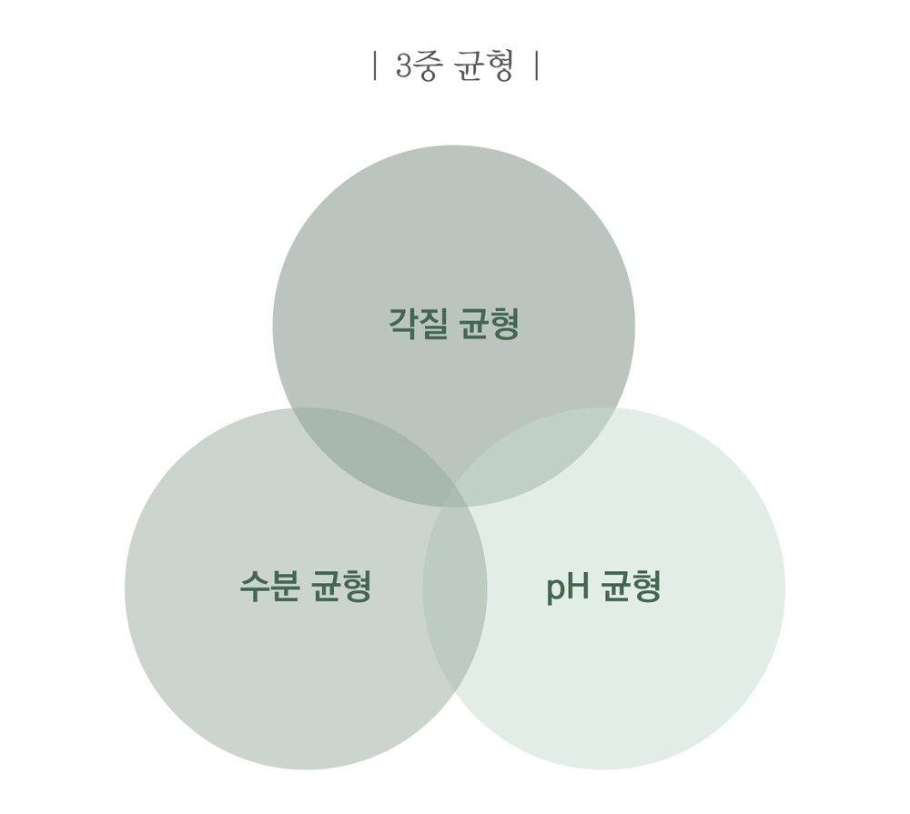 피부에 부족한 것을 채워줄 때 화장품이 피부에 줄 수 있는 최대한의 효능이 발휘되는데요. 화장도 잘 안 먹고, 탁한 피부 상태에 부족한 것은 위의 세 가지 균형에요.