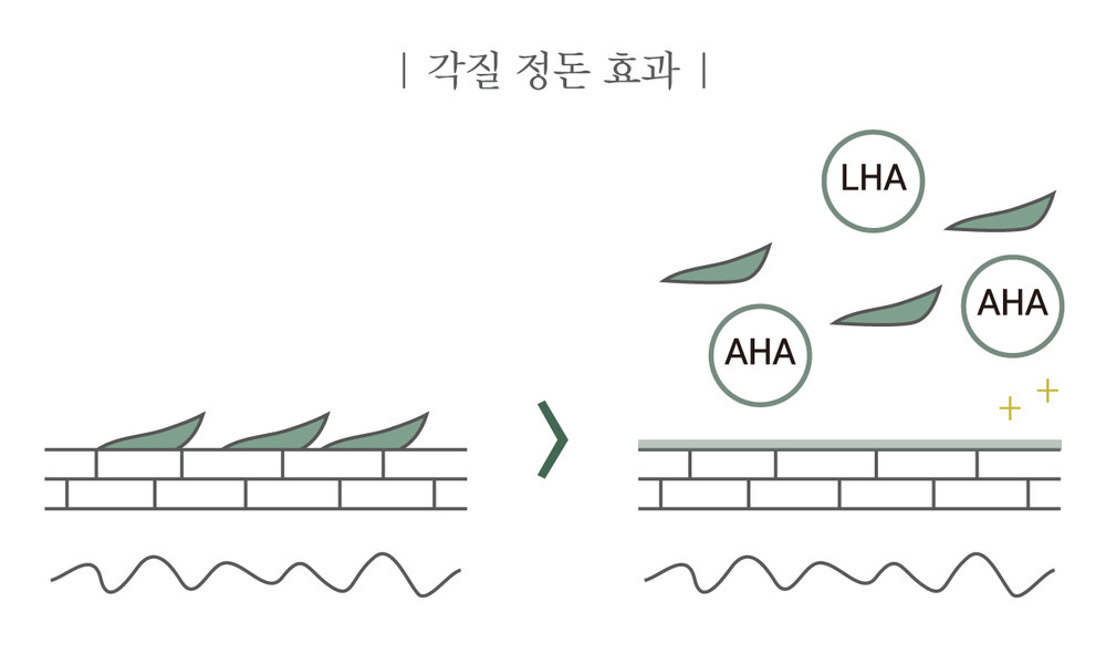 우리 피부 겉 각질층은 약 15~20장으로 크로아상처럼 겹겹이 쌓여 있어요. 그런데 나이가 들수록 각질이 생성되고 떨어져나가는 속도가 느려지면서, 또 여러 가지 환경과 요인에 의해서 각질층의 숫자가 늘어날 수 있어요. 이때, 피부 겉의 오래된 각질이 부드럽게 떨어져나갈 수 있도록 도와주는 화학적 각질 정돈 성분 AHA와 LHA가 각질 균형을 잡는 데 도움을 줍니다. 이 두 성분이 함께 시너지를 내서 피부 겉의 오래된 각질이 부드럽게 떨어져나갈 수 있도록 도와주면 새 각질이 나와 화장이 잘 먹는 결을 만나볼 수 있을 거예요. 특히 지성 피부와 에이징 피부의 홈케어 시스템에서 빛을 발하는 성분입니다.