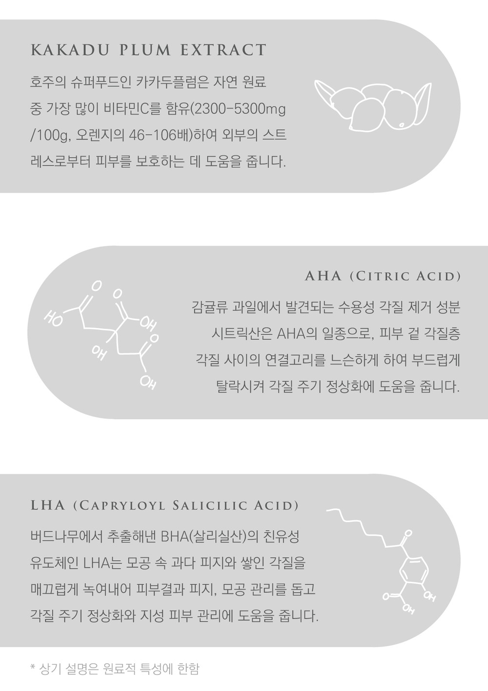 카카두플럼추출물(90%), 부틸렌글라이콜, 다이프로필렌글라이콜, 나이아신아마이드, 글리세린, 폴리글리세릴-4카프레이트, 해바라기씨오일, 병풀추출물, 보스웰리아수지추출물, 사카라이드아이소머레이트, 베타인, 소듐하이알루로네이트, 알란토인, 마데카식애씨드, 아시아티코사이드, 아시아틱애씨드, 아데노신, 카프릴로일살리실릭애씨드(LHA 0.01%), 시트릭애씨드(AHA 0.1%), 소듐시트레이트, 1,2-헥산다이올, 카프릴하이드록사믹애씨드, 로즈마리잎오일